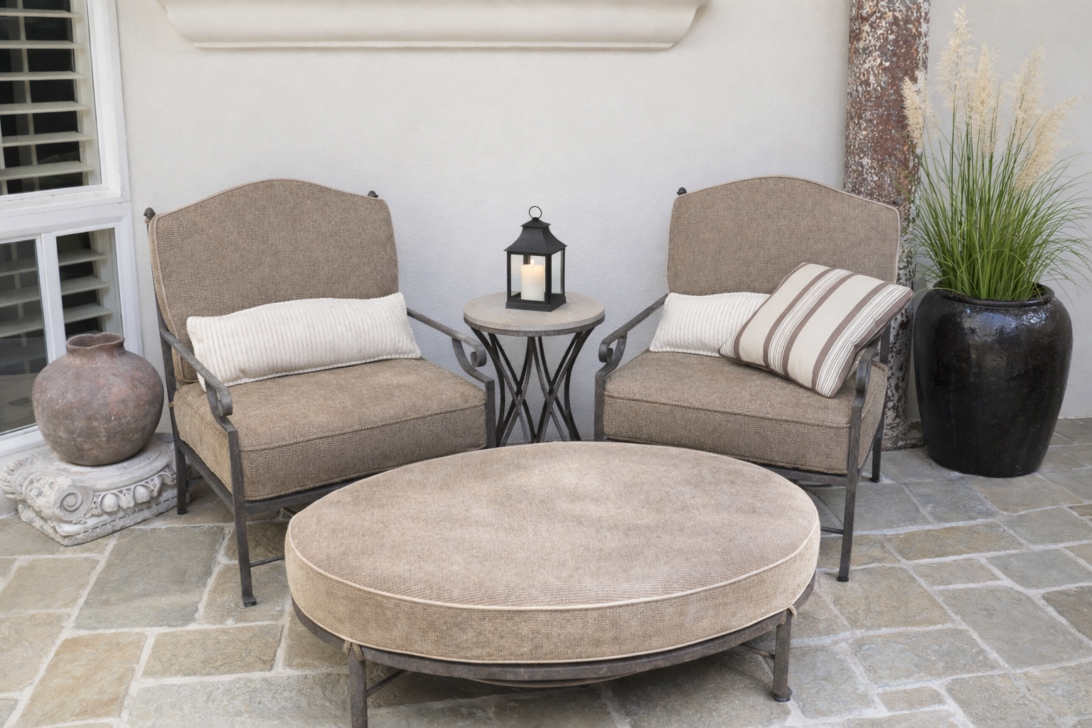 Iron Frame. Aged Metal Exterior Metal Finish. Optional Polished Brass Finials. Optional Cushions & Lumbar Pillow. Shown with Chesterfield Ottoman. (each piece sold separately)