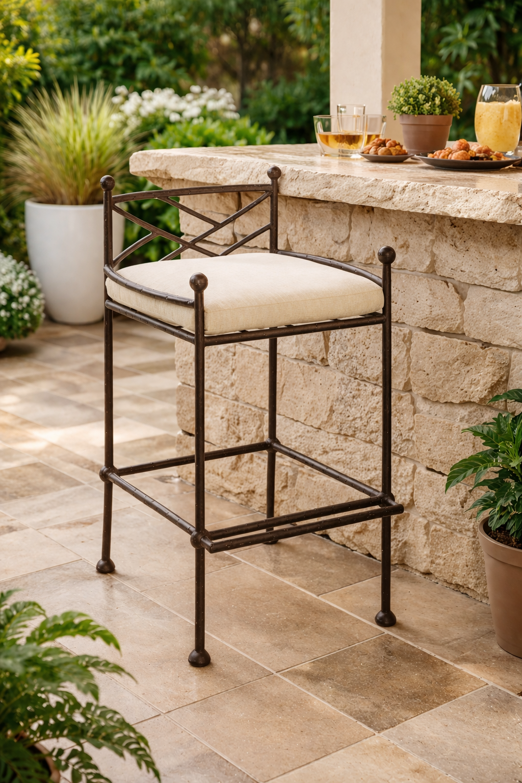 Counter Height. Iron Frame. Mother Earth with Texture Exterior Metal Finish. Optional Cushions.